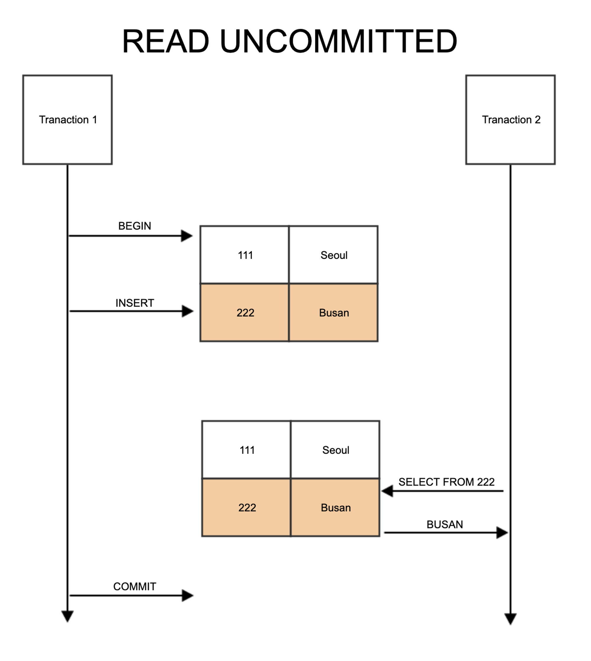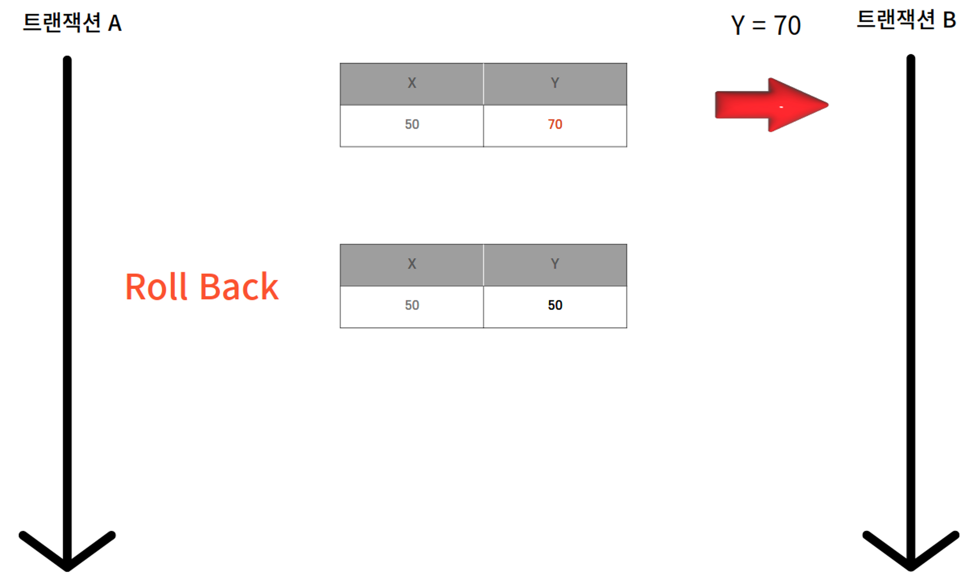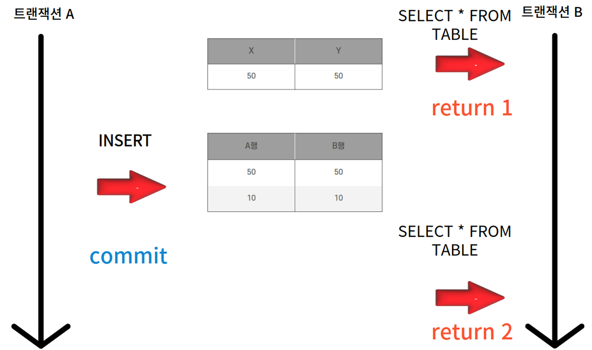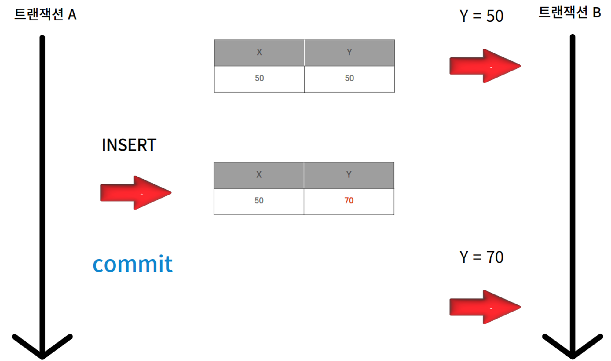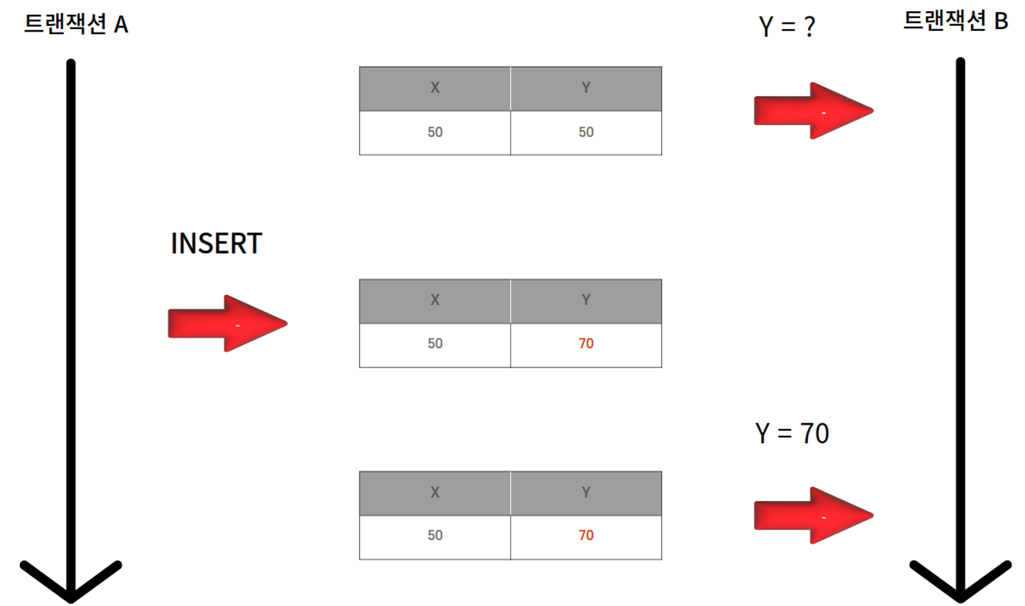 νμ§λ§ Bκ° λ°μ΄ν°λ₯Ό μ½λ λμ€ νΈλμμ Aκ° Yμ λ°μ΄ν°λ₯Ό λ³κ²½νμκ³ Bλ 격리λ 벨 νΉμ±μ 컀λ°λμ§ μμ λ°μ΄ν°λ₯Ό μ½κ² λμλ€.