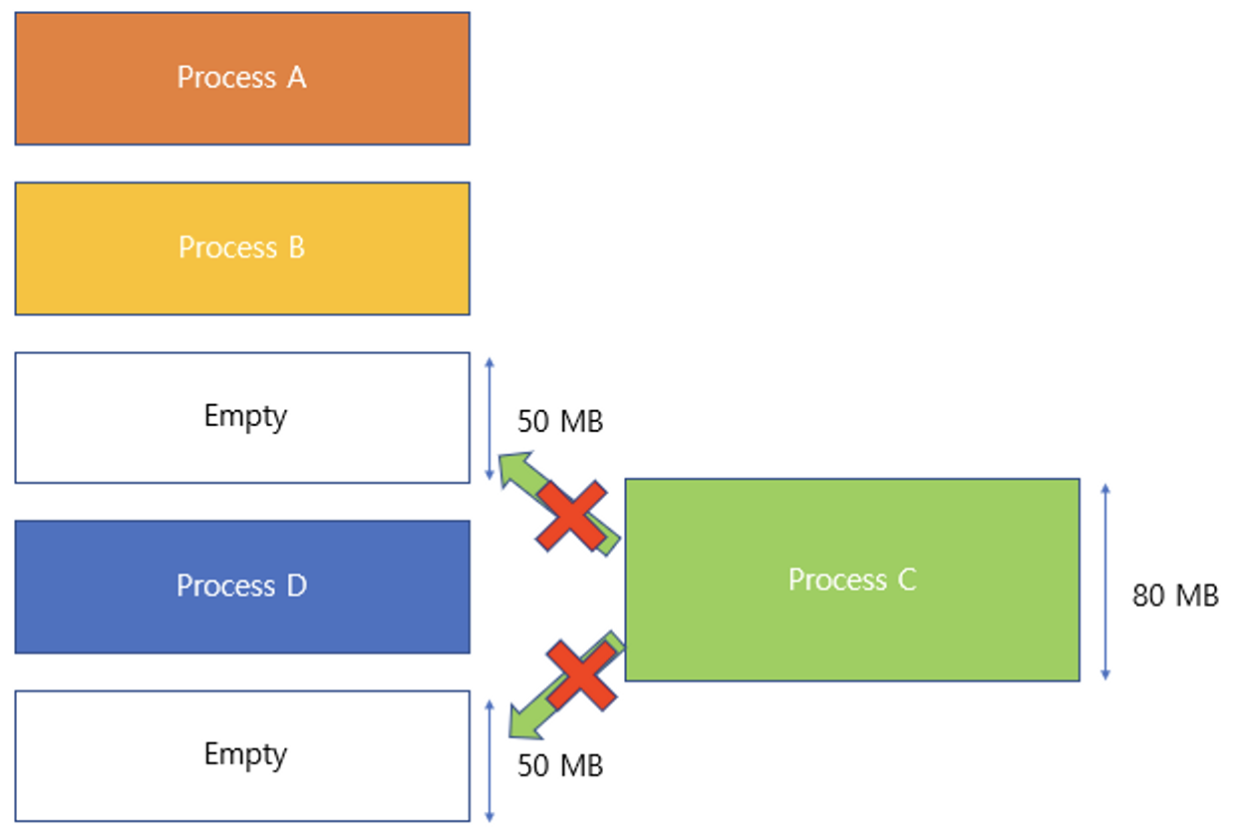 ๋ฉ๋ชจ๋ฆฌ์ ๋น ๊ณต๊ฐ์ด 20MB , 30MB๊ฐ ์๋๋ผ๋ 50MB๋ ํ ๋น์ด ๋ถ๊ฐ๋ฅํ๋ค. ์ด ๋๊ฐ์ ๋ฉ๋ชจ๋ฆฌ๋ ๋๋์ด์ ธ ์๊ธฐ ๋๋ฌธ์ด๋ค.