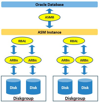 RBAL : ๋์คํฌ๋ฅผ ์ถ๊ฐ/์ญ์ ํ ๋๋ง๋ค Rebalancing์ ์ํํ๋ค. ๋ํ, ASM Instance์ ์์ฒญ์ด ์์ ๊ฒฝ์ฐ ๋์คํฌ๋ฅผ ์ ์ดํ๋ค.